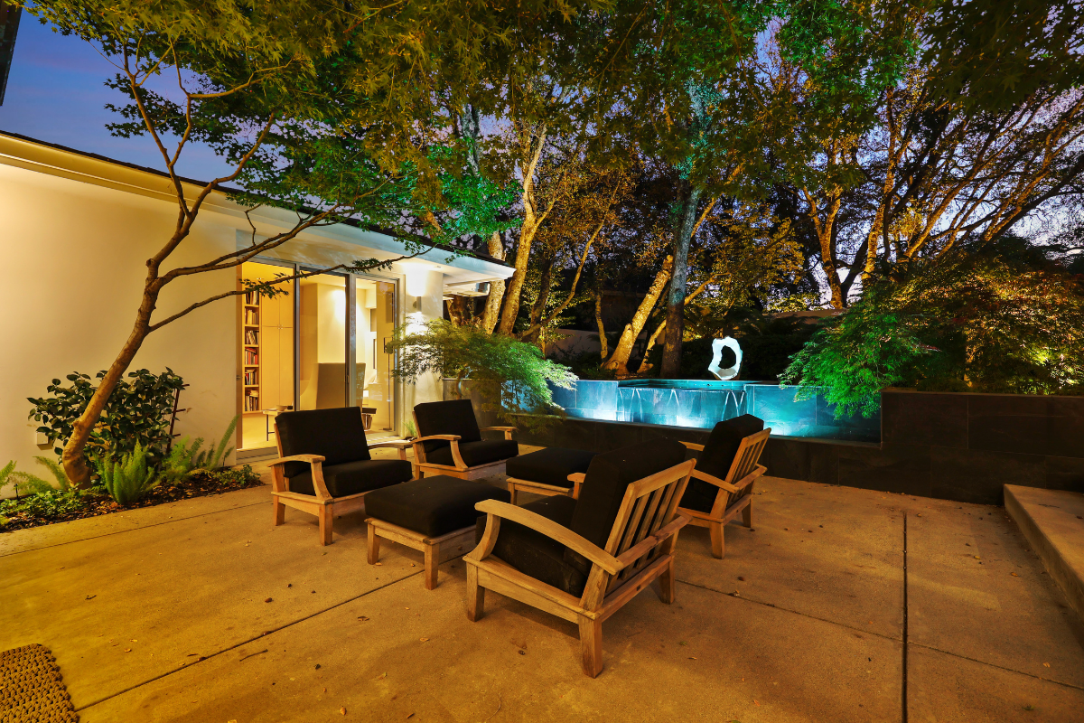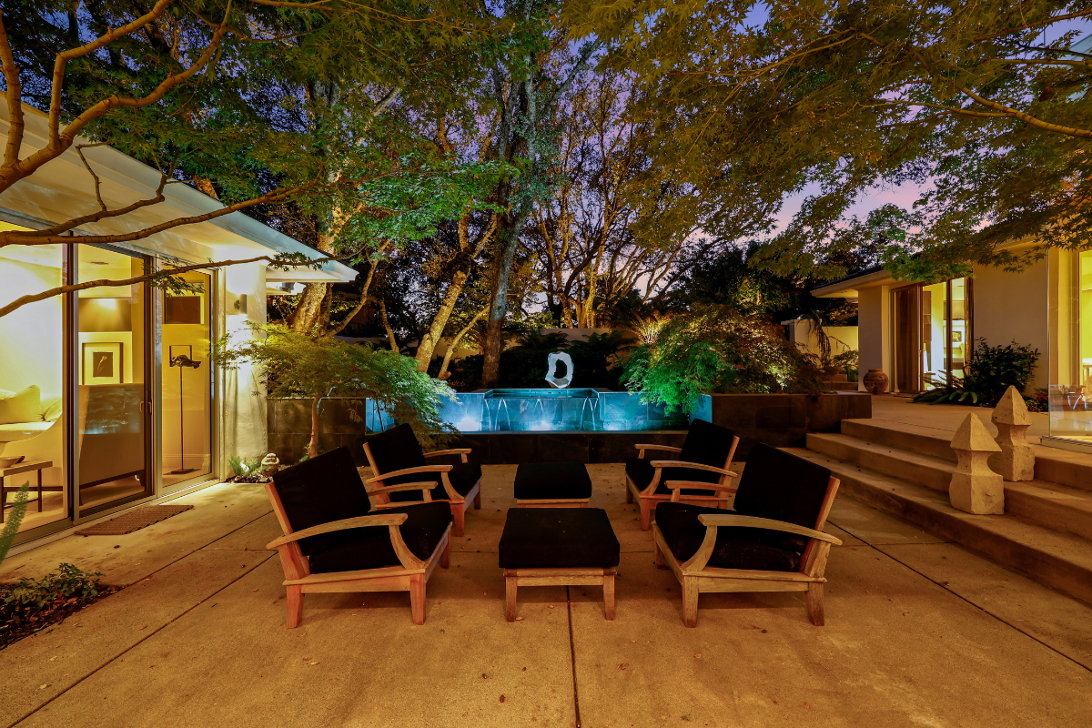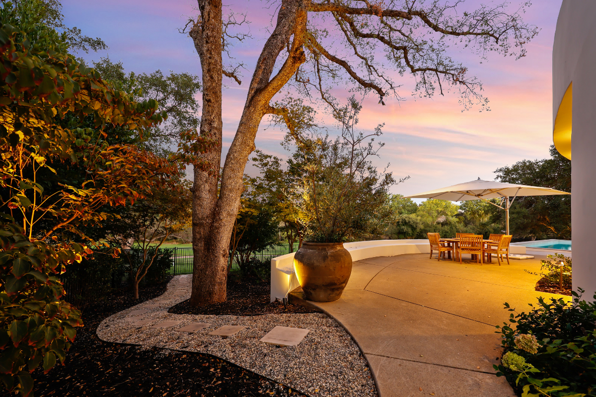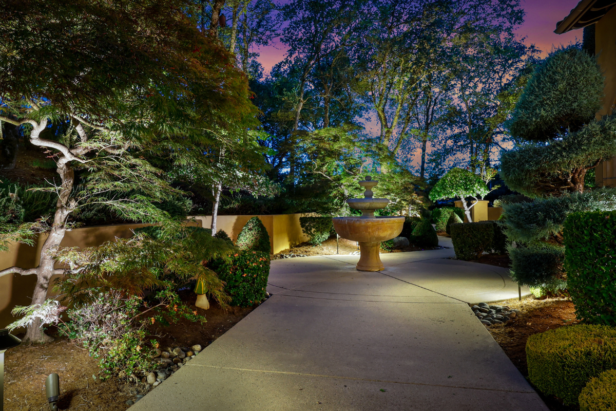 We used 80 fixtures and four transformers to completely overhaul their front yard, courtyard, and backyard lighting. Their courtyard features a lovely color-changing water feature and plant material that can be seen from inside the house. Landscape lighting added another style element to their home’s exterior.