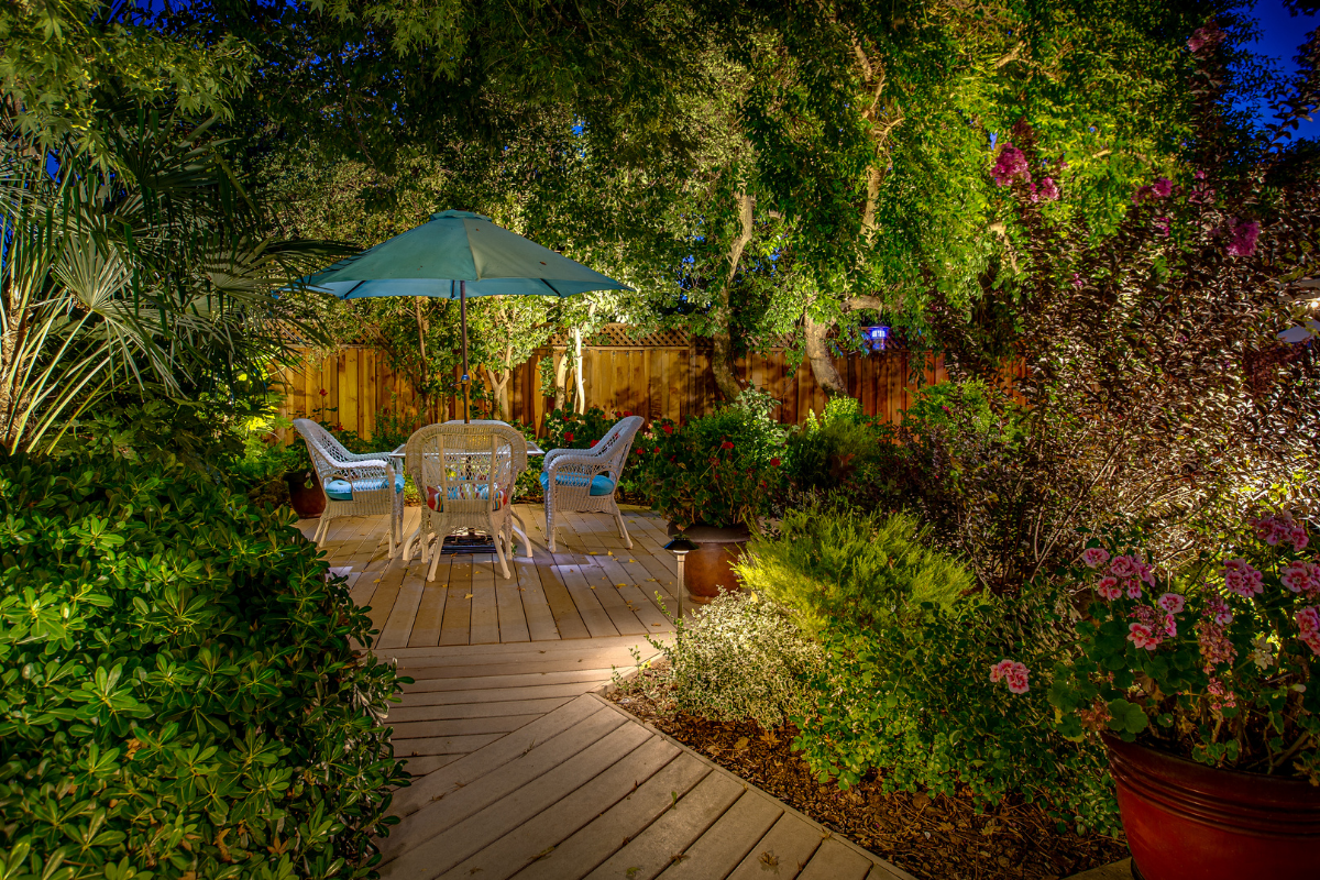 One year later, we got a call from the client that they were ready to re-landscape and light their backyard. The backyard features a significant amount of downlighting. It was one of our technician’s first days on the job – he took on all the ladder work in the trees!