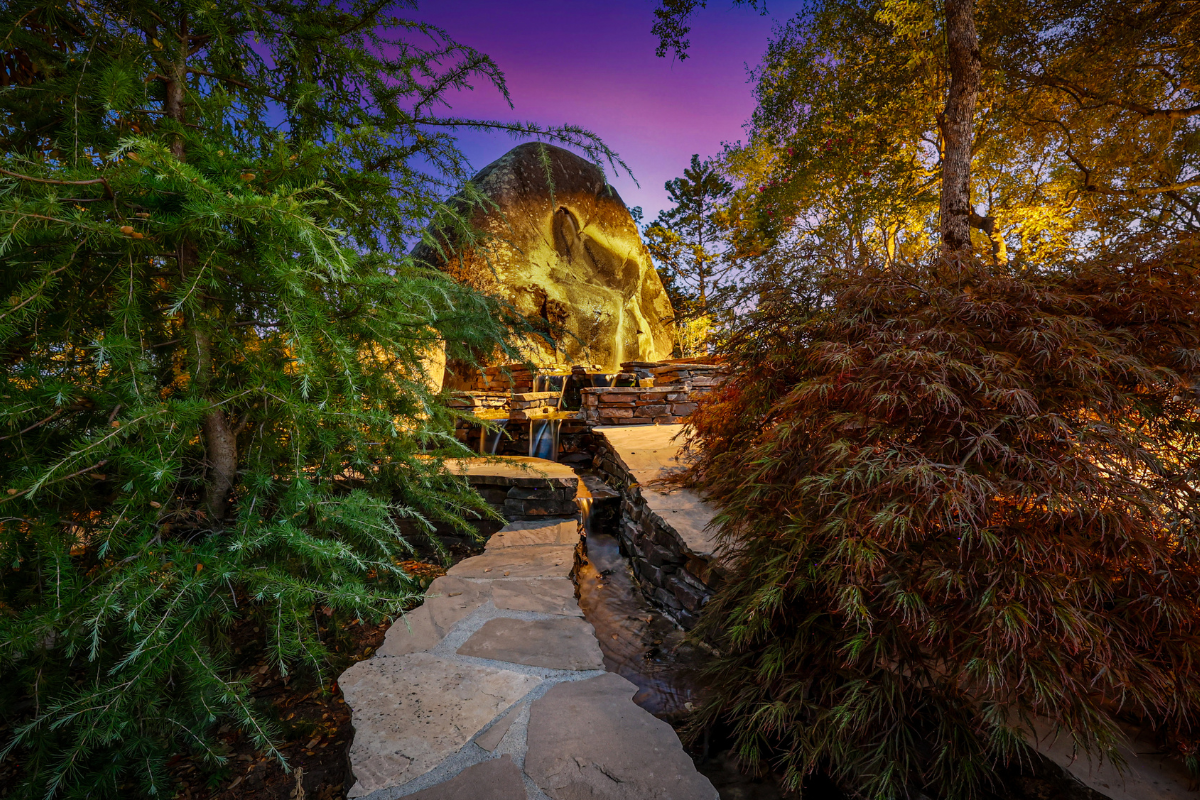 The project included a total of about 70 fixtures and two transformers. With brand-new landscaping, the property featured exquisite plant material that was a joy to work with. We used various techniques to accentuate their home, including wash lighting on low-level plants and boulders, path lighting along walkways, and uplighting on multiple trees.